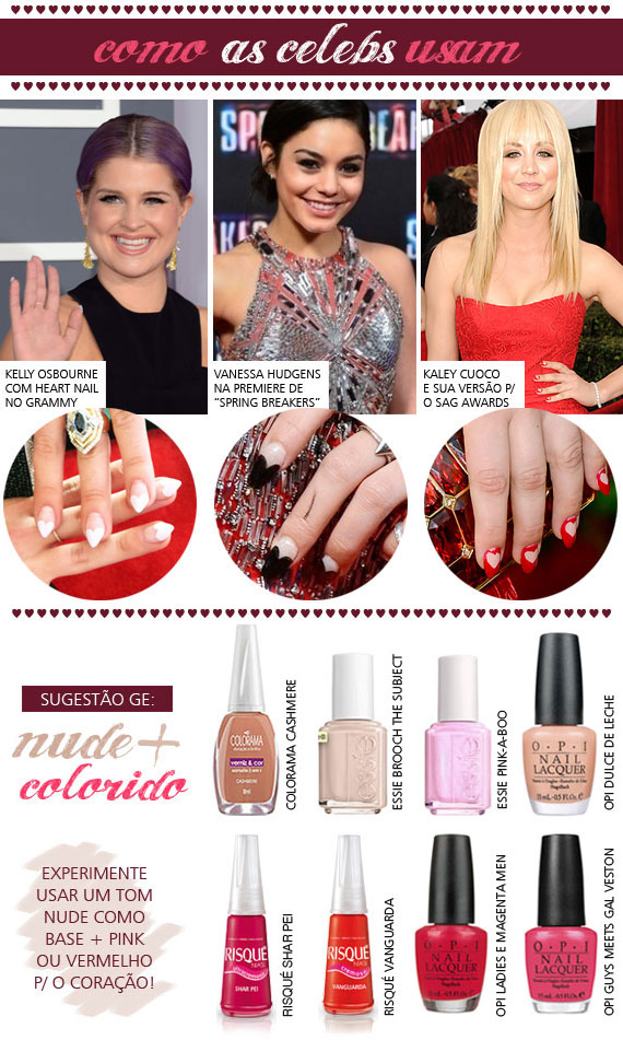 Na maioria das vezes, foi usada uma base nude ou transparente, dando destaque a cor do coração, que vai bem além do tradicional vermelho. Para ficar mais divertido, aposte nas cores metálicas, preto, branco ou até mesmo neon.